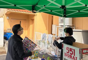 今年は「肉まん」「やきそば」「駄菓子つかみどり」「スーパーボールくじ」「鈴くじ」「ワンピースカード」「高知県特選品販売」をお祭り屋台形式で出店させていただき、250食を完売しました!